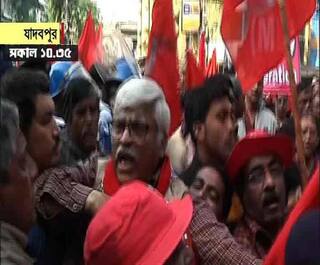 ধর্মঘটকে কেন্দ্র করে যাদবপুরে ধুন্ধুমার। রাস্তায় আগুন জ্বালিয়ে বিক্ষোভ। পুলিশের গাড়িতে ভাঙচুর। উল্টে ফেলা হয় গার্ড রেল। বিক্ষোভ হঠাতে লাঠিচার্জ পুলিশের। এলাকায় মোতায়েন র্যাফ। গ্রেফতার সুজন চক্রবর্তী-সহ কয়েকজন বাম কর্মী-সমর্থক। সকালেই যাদবপুরের ৮বিতে ধর্মঘটের সমর্থনে মিছিল করেন বাম কর্মী-সমর্থকরা। পরে যাদবপুর স্টেশনে কিছুক্ষণ অবরোধ করেন তাঁরা